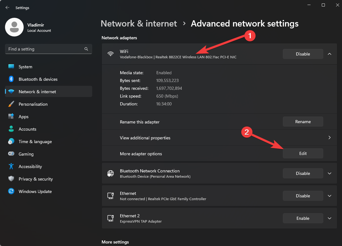 3. Click the network connection you’re using, and click the Edit button in the More Adapter Options section.