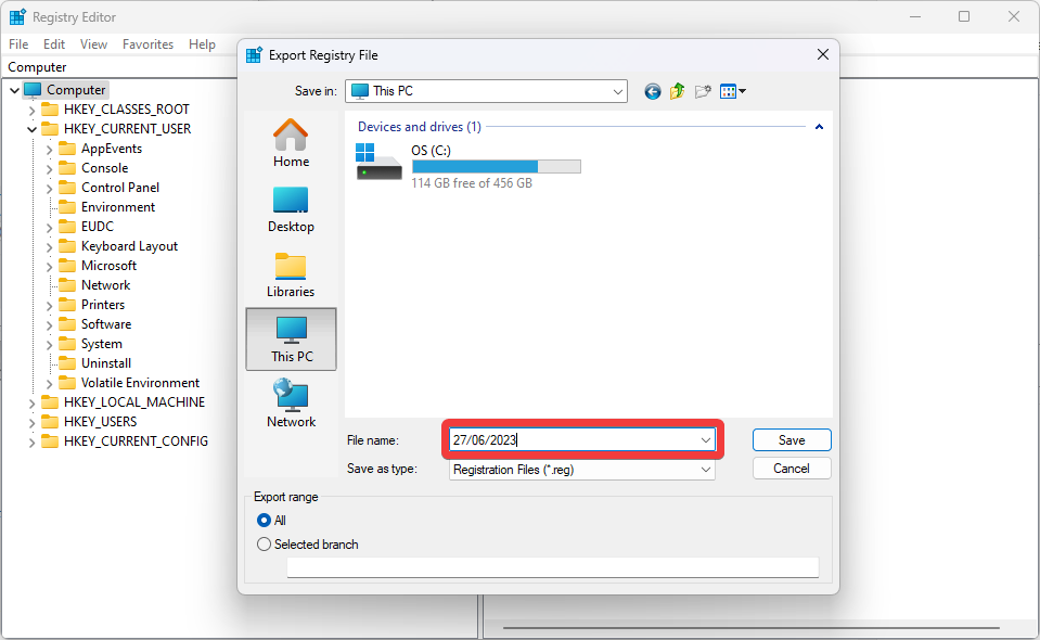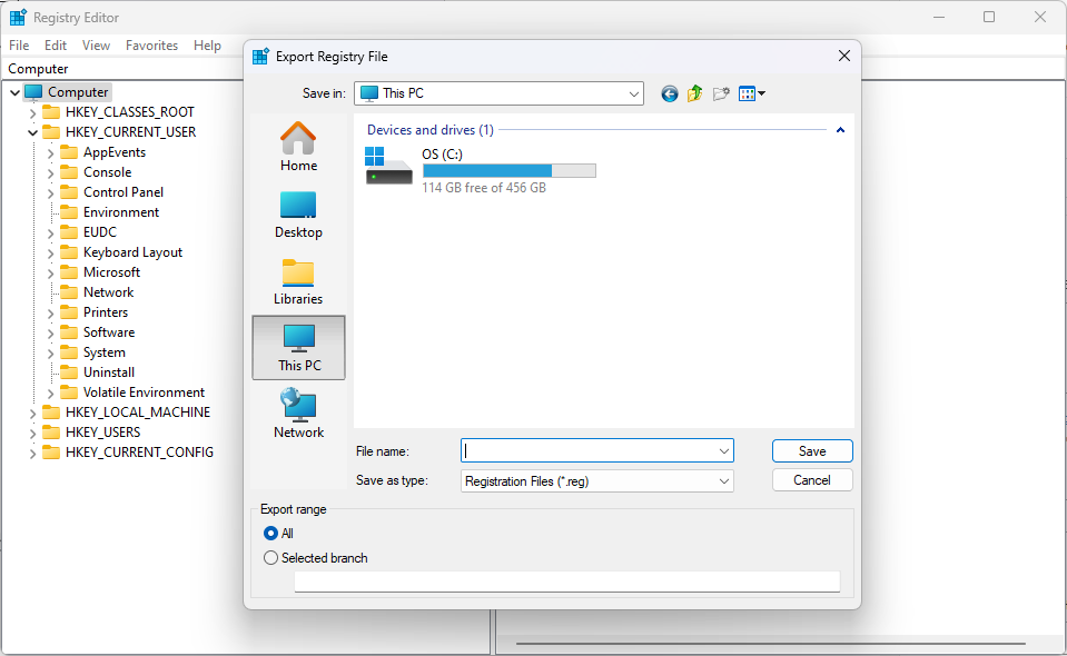 The dialog box Export Registry File will appear.