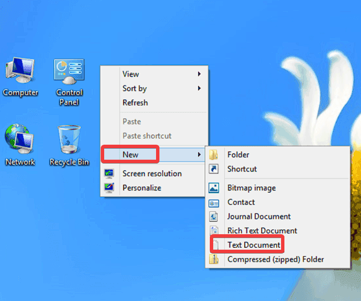 1. Open a new Notepad file by right-clicking an empty space on the Desktop, choosing New, and then Text Document.
