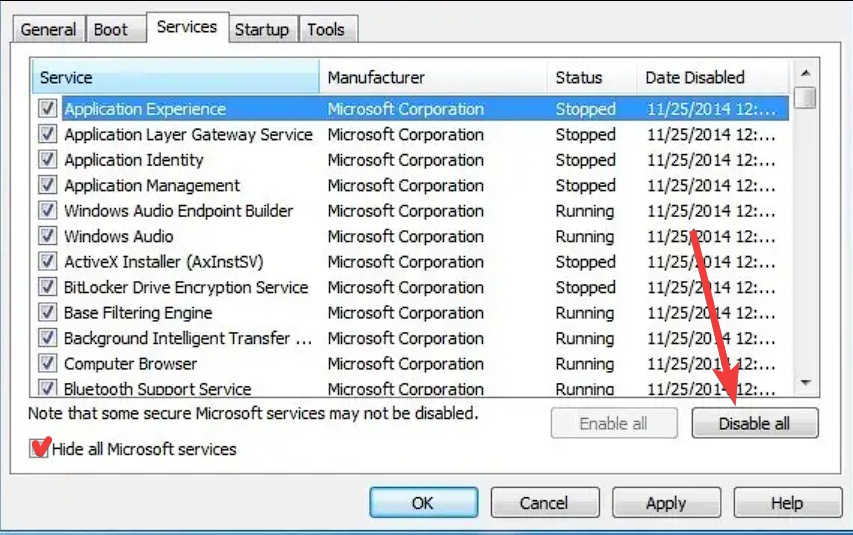 4. Click Disable All to disable the remaining non-Microsoft services.