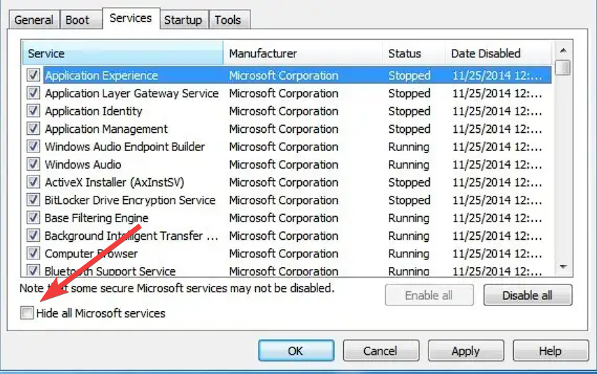 3. Navigate to the Services tab and check the box next to the Hide all Microsoft services option.