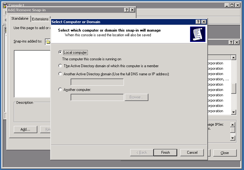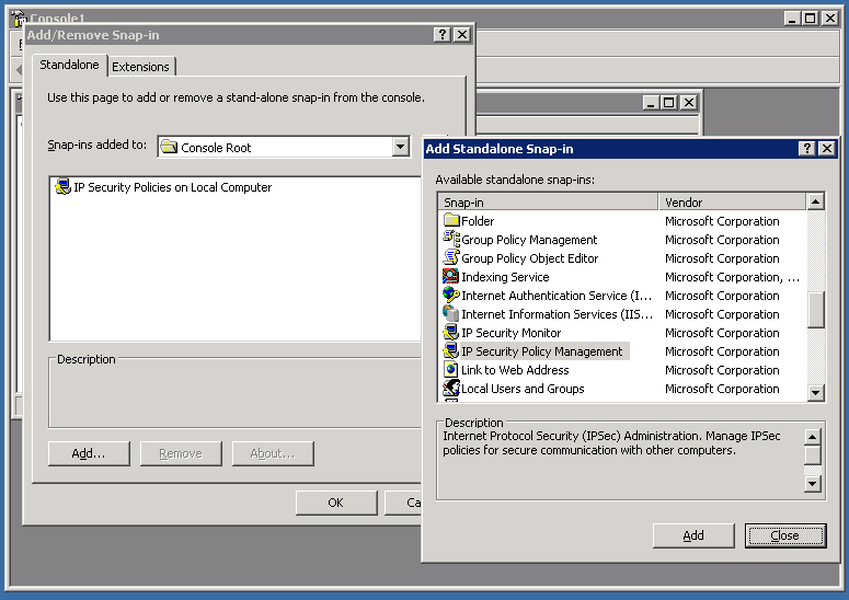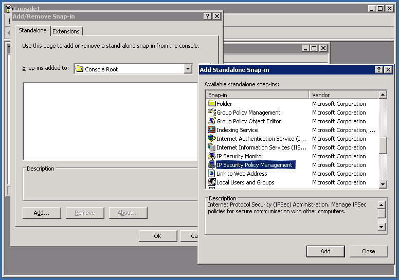 3. Click the Add button, choose IP Security Policy Management, and click the Add button again.
