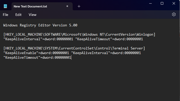 The registry settings for managing the terminal services and remote desktop connections will be modified by creating and running the .reg file. Keep-alive packets are sent at intervals of one second to avoid disconnections using the “KeepAliveInterval” and “KeepAliveTimeout” variables set to 1.