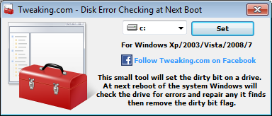 Usually, you would set a drive error check by using the tools tab on the properties of a drive. The odd thing is sometimes it won’t set, and you would have to do it again to get the system to scan the drive. This wasn’t very pleasant. So I made this tool easier and faster to get the drive error check going.
