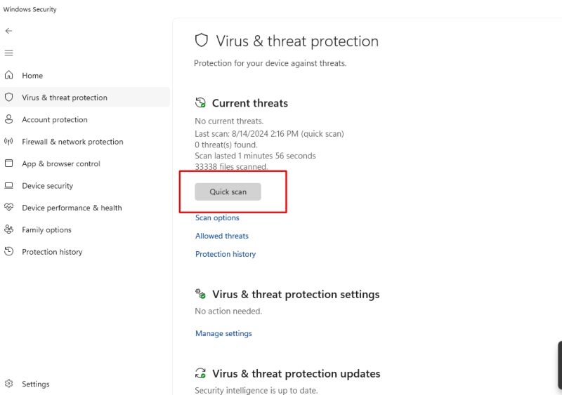 - Open Windows Security > Virus & Threat Protection.
