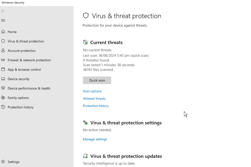 • Windows Security Scan: Go to Settings > Update & Security > Windows Security > Virus & Threat Protection and run a Quick or Full Scan.
