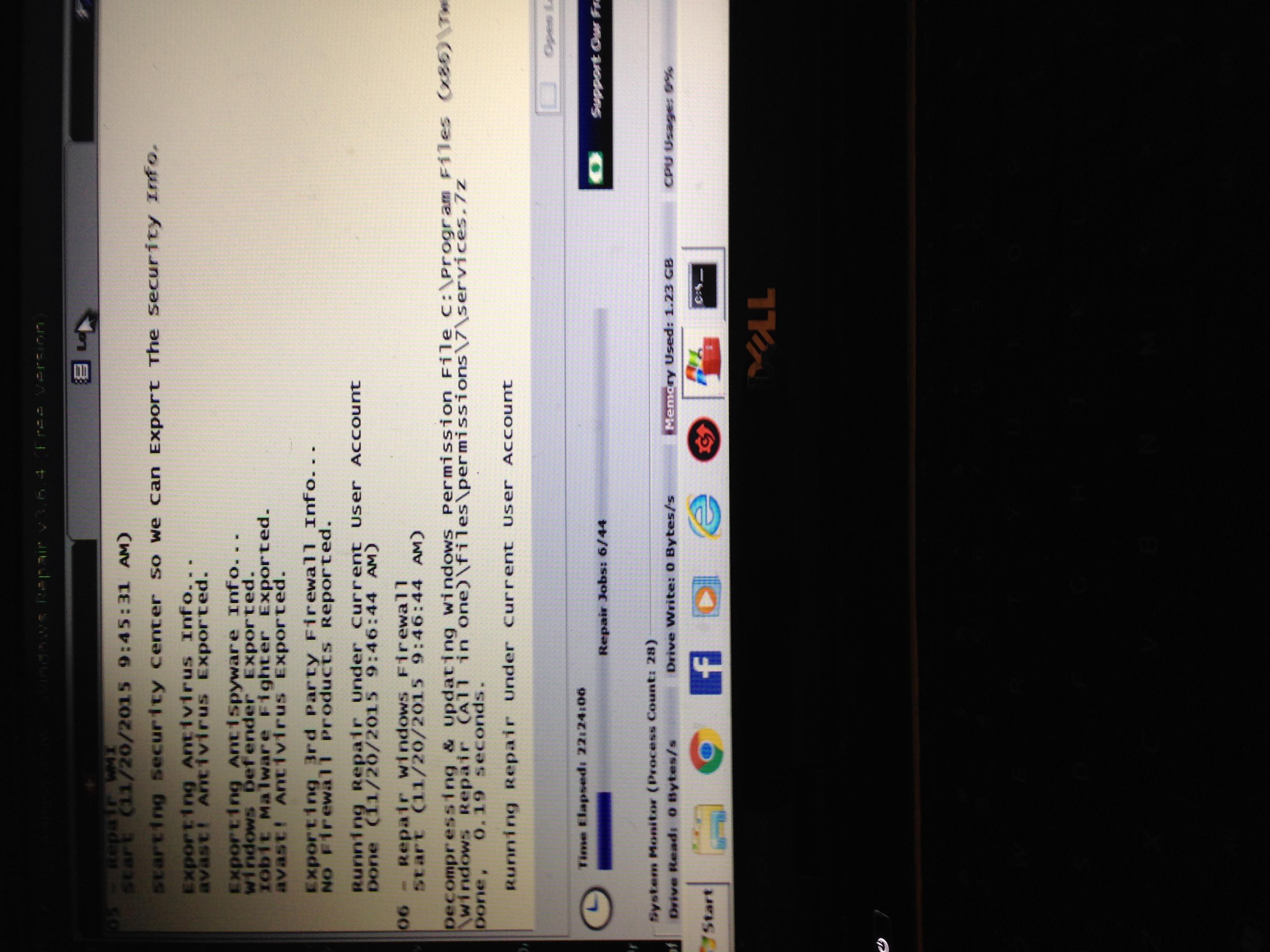 :confused: I hope you can help me... I started the repair Thursday night, doing steps 1-4 I believe. Then I did a shut down & started the repair process Friday morning. Well, it's still running??? It's been stuck on repair job 6/44 (repair Windows firewall) for a day & 7 hours 😐 Is this normal?? What should I be doing differently? I am running Windows 7. I've attached a picture of the screen from this morning when it was running. CPU usage goes anywhere from 0-0.368%, 0.735% & occasionally up to 1+%, so I believe it's still running/working (but what do I know) & not stalled out but why isn't it progressing?? TIA for any help!!