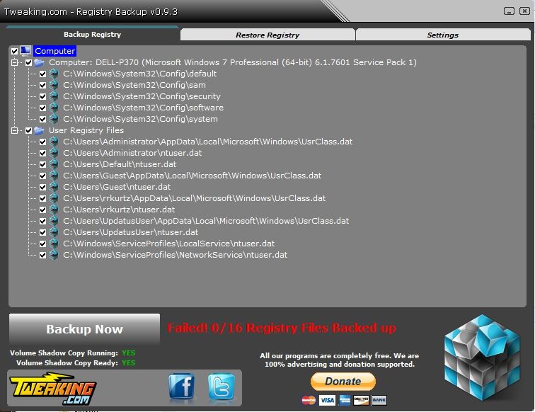 Backup by using "Task scheduler" doesn't work for me. Then I look in "Process explorer" under taskeng.exe the TweakingRegistryBackup.exe start but it doesn't do anything. I have tried to change options in Task scheduler but nothing helps. I can do a backup manually and "Volume Shadow Copy" works.